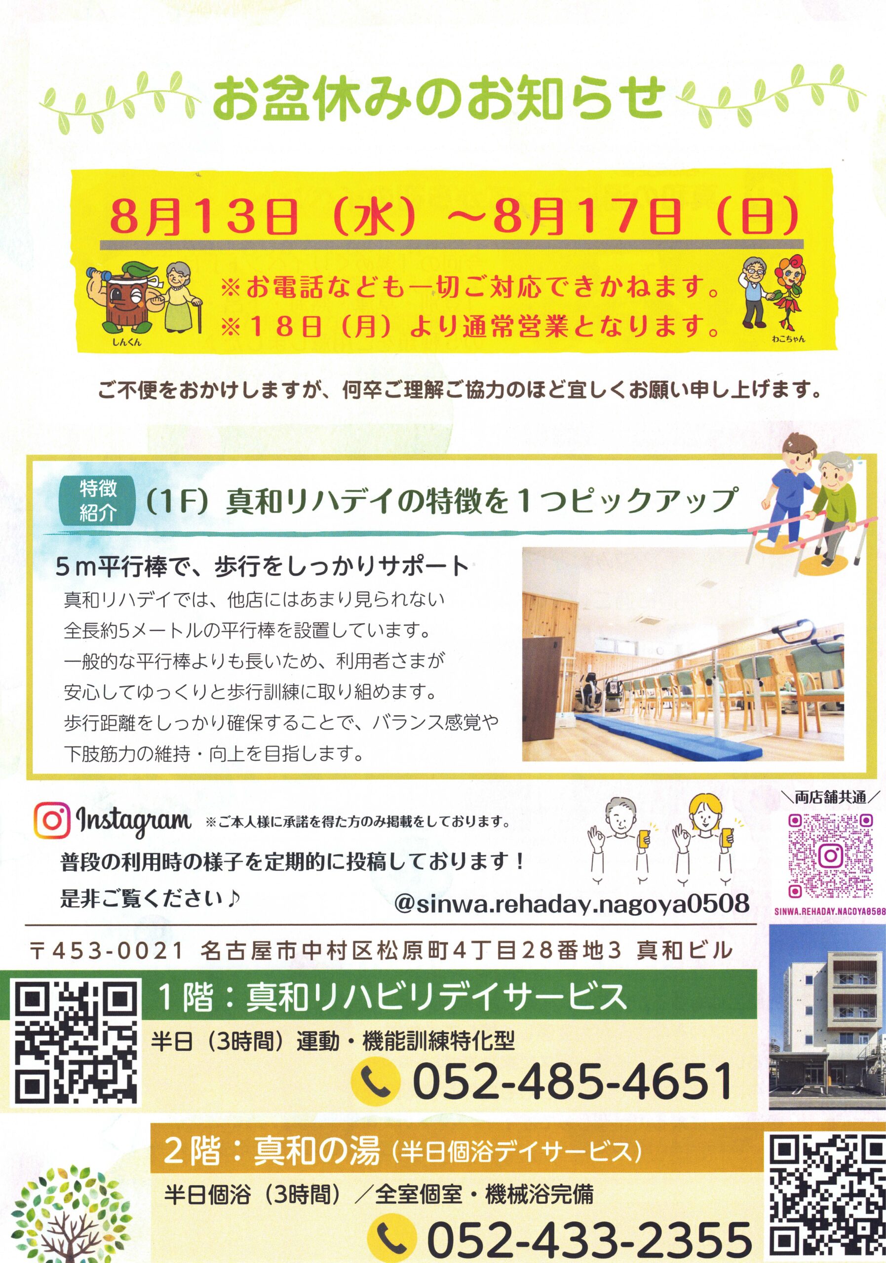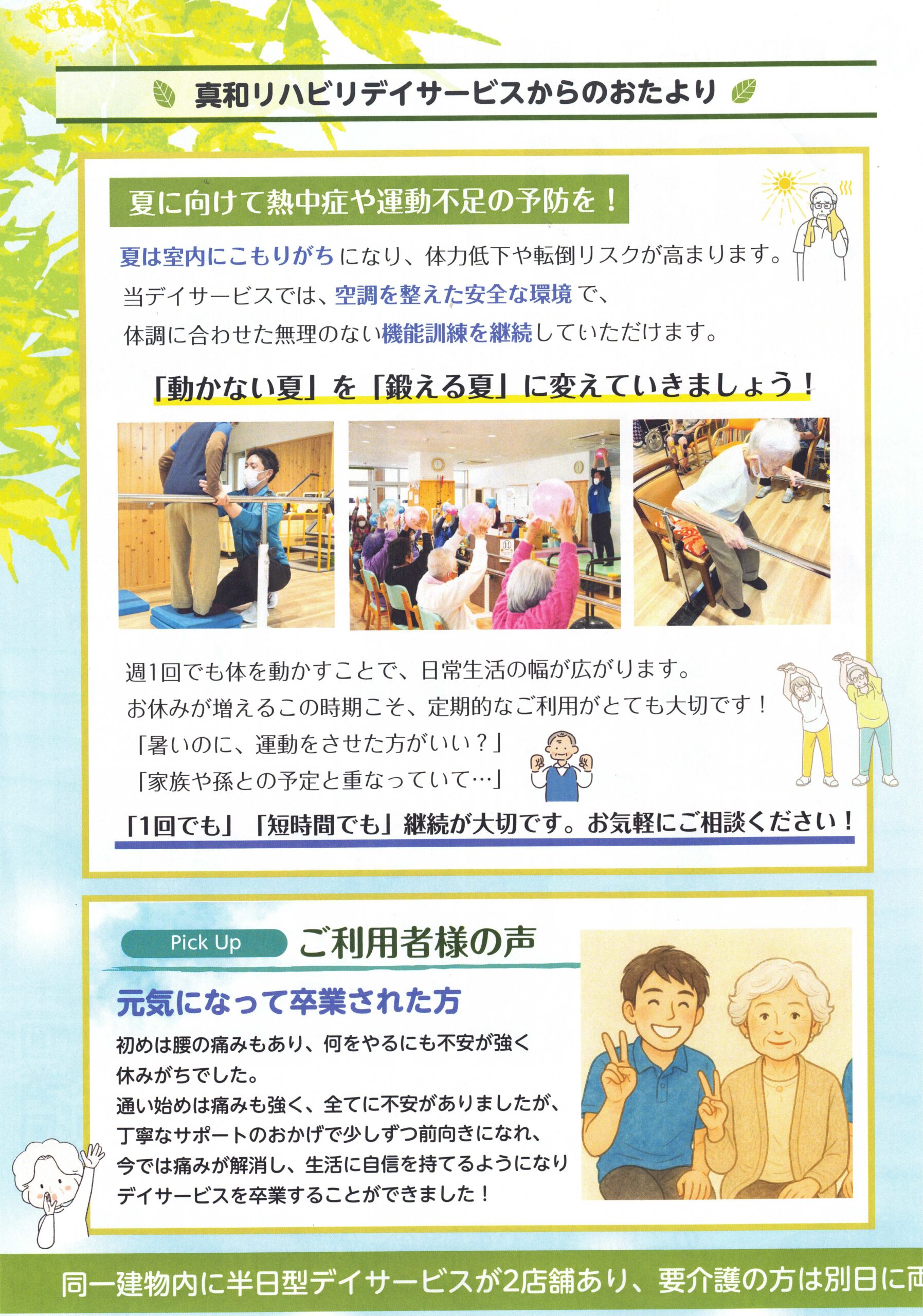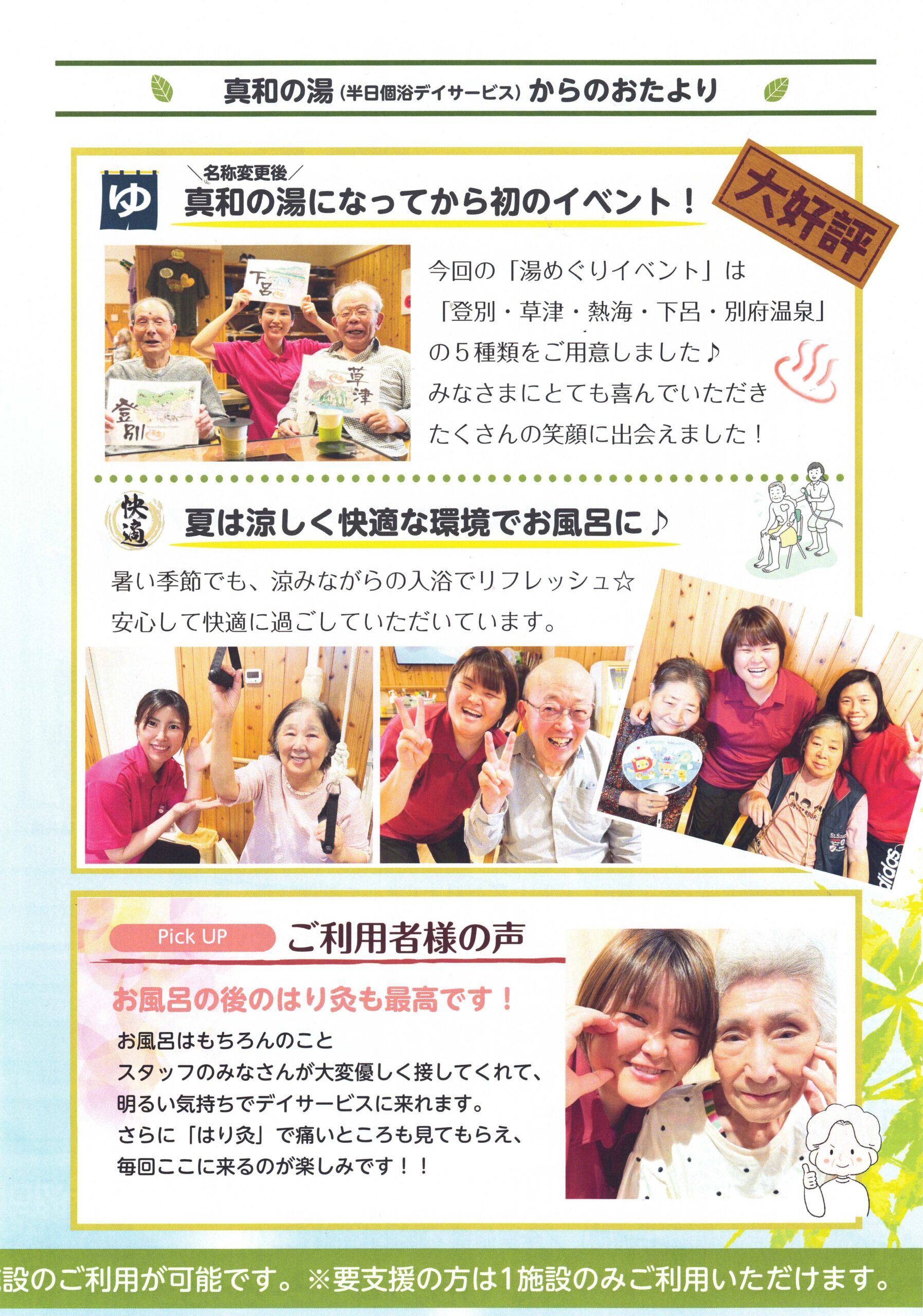 真和だより 一覧 リスト当店(真和の湯)及び系列店(真和リハビリデイサービス)に関する「真和だより」を春夏秋冬の4シーズンに分けて配布・公開して参ります。日常やデイサービスの様々な情報をお届けしてまいります。【発行】株式会社エス・ジー・ティ(担当:藤原・松瀬) 2025年 夏季号(No.8) NO1 NO2 NO3 NO4 2025年 春季号(No.7) NO1 NO2 NO3 NO4 2024年 冬季号(No.6) NO1 NO2 NO3 NO4 2024年 秋季号(No.5)※(誤り)表紙の季号が誤りにより秋ではなく夏号の表記になります。 no1 no2 no3 no4 2024年 夏季号(No.4) ページ1 ページ2 ページ3 ページ4 2023年 秋季号(No.3) 2023年 夏季号(No.2) 2023年 春季号(No.1) 無断転載・二次利用の禁止 本サイトに掲載する全てのコンテンツ (文章・画像・映像・音声・ロゴ・レイアウト・プログラム・データベース等)の 著作権その他一切の知的財産権は、当社または正当な権利者に帰属します。 事前の書面による許諾なく、下記を含む一切の二次利用を固く禁じます。 複製・複写・ダウンロード保存・スクリーンショットの配布 転載・再配布・公衆送信(SNS・動画投稿サイト等へのアップロード含む) 転用・編集・改変・翻案・翻訳・要約の公開 販売・賃貸・商用利用・広告素材化 データ抽出・スクレイピング・AI学習用データセットへの取り込み 引用の範囲を逸脱した掲載(出典不明示・改変引用 等) 報道等での引用は、著作権法に基づく適法な引用要件 (主従関係・必要最小限・出典明示・改変不可)を満たす場合に限り認めます。 それ以外の利用は、必ず事前にお問い合わせください。 違反が判明した場合、損害賠償請求・差止請求・発信者情報開示請求等の法的措置を講じることがあります。