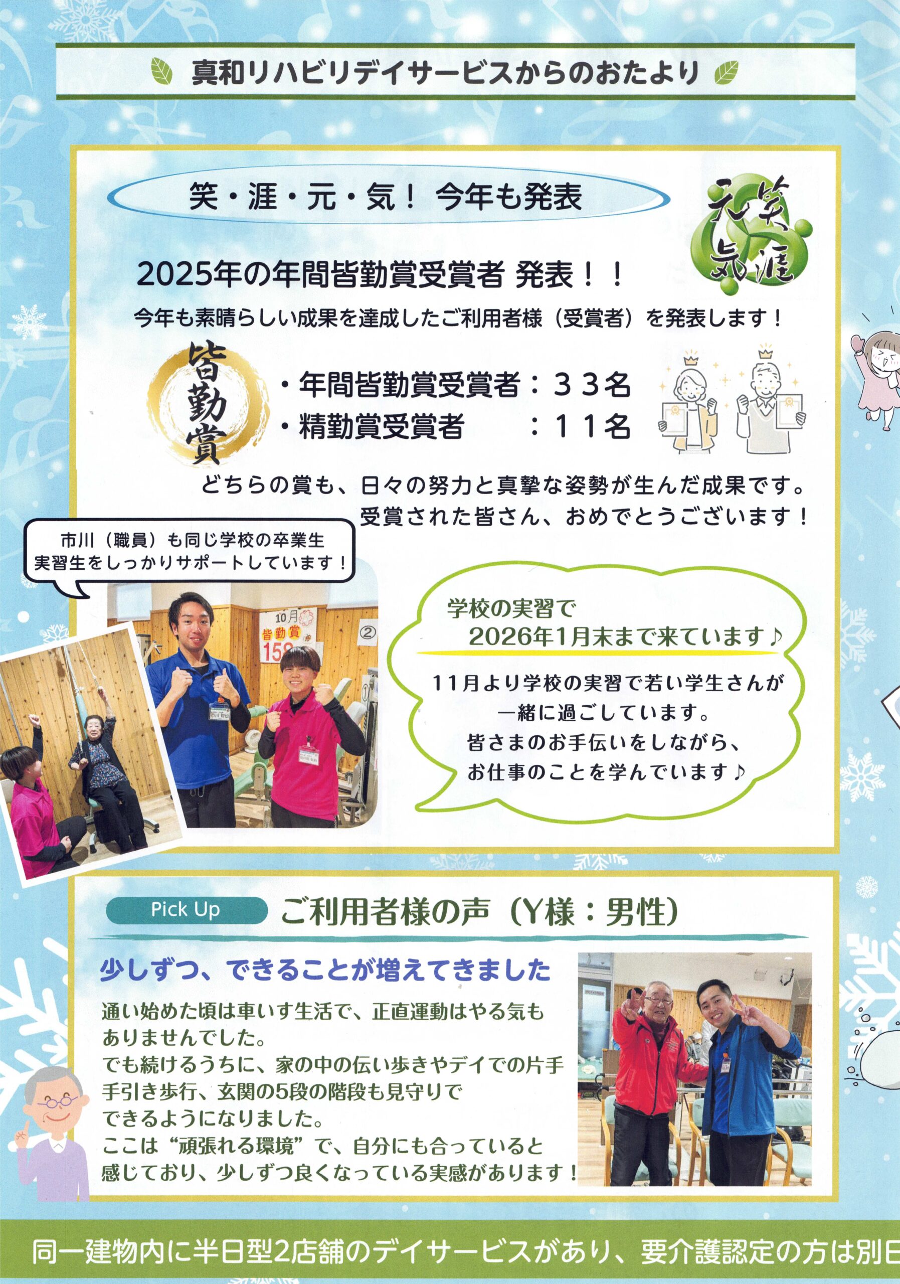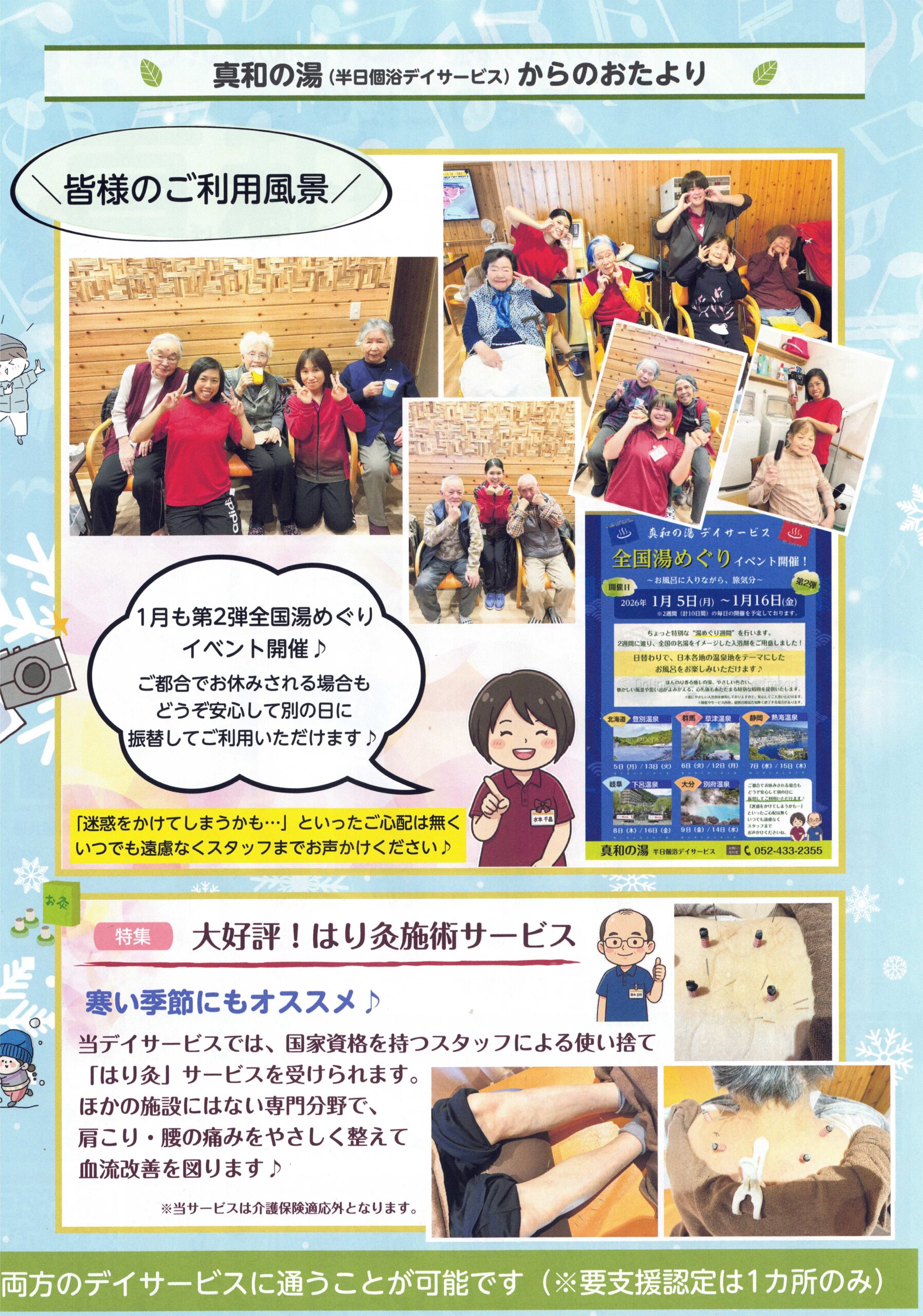 当店(真和の湯)及び系列店(真和リハビリデイサービス)に関する「真和だより」を春夏秋冬の4シーズンに分けて配布・公開して参ります。日常やデイサービスの様々な情報をお届けしてまいります。